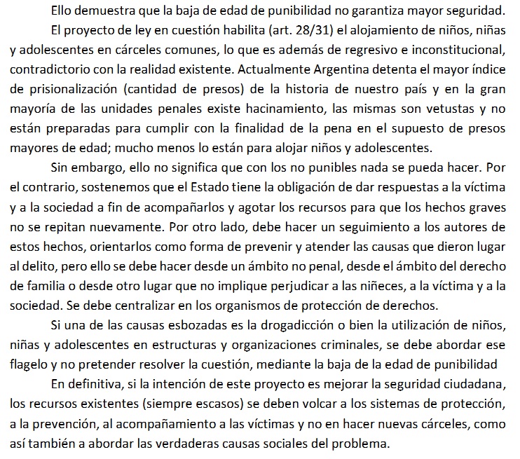 El proyecto es perjudicial porque está comprobado que la privación de libertad afecta el desarrollo emocional del adolescente y que el contexto carcelario favorece a una dinámica de violencia, reproducción de traumas y consolidación de identidades negativas.