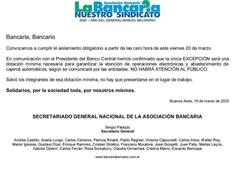 Trabajadores y trabajadoras afiliados a La Bancaria, emitieron un comunicado que hicieron público a través de su referente, Sergio Omar Palazzo.