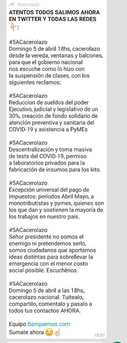 Con respecto a la conocida “espontaneidad” de los cacerolazos, Jorge Rial reveló que el ex jefe de Gabinete Marcos Peña propone golpear las ollas el 5 de abril a las 18 con el fin de desestabilizar al gobierno. Rial publicó una captura del mensaje de WhatsApp en el que el ex funcionario brinda precisas instrucciones a su ejército de odiadores.