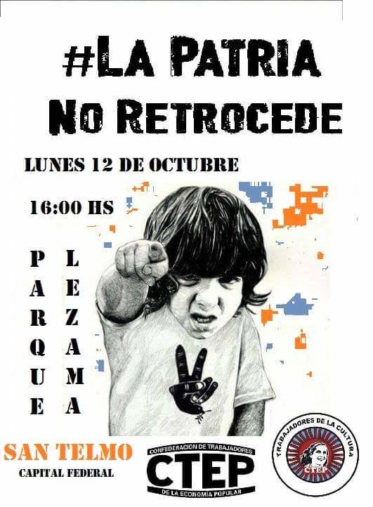 Este lunes 12 de octubre se realizará una gran peña bailable en el Anfiteatro del Parque Lezama, a partir de las 16 hs. La misma contará con con la presencia de reconocidos artistas como Peteco Carabajal, Bruno Arias, además habrá una Feria de Economía Popular. De esta forma expresaremos también nuestro descontento con las prácticas político culturales de la ciudad, que representa el neo liberalismo expresado en el candidato del pro Mauricio Macri.