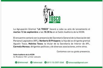 La Agrupación Gremial “La Tosco” llevará a cabo su acto de lanzamiento el martes 12 de septiembre desde las 18.30, en el Salón Auditorio de la Cámara de Diputados de la Nación.