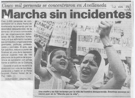 Fue en la Plaza Alsina, Avellaneda, cuando una mujer junto a su hija fueron captadas por el ojo comprometido de Lestido, en aquella marcha por familiares desaparecidos durante la dictadura que había comenzado en 1976, en nuestro país y aun estaba vigente, al momento de la foto, viernes 26 de noviembre de 1982.-