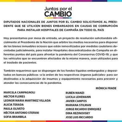 Solicitan al Presidente de la Nación «que se utilicen bienes embargados en causas de corrupción para instalar hospitales de campaña en todo el país», aludiendo seguramente a lo que denominan «la corrupción K».