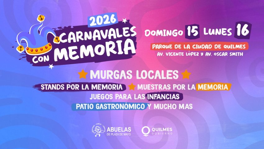 El Municipio de Quilmes invita a las y los vecinos a la celebración de los Carnavales 2026, que en esta ocasión se desarrollarán bajo el lema de «Carnavales con Memoria». Los festejos oficiales de los mismos se llevarán a cabo el domingo 15 y el lunes 16 de febrero, en el Parque de la Ciudad (avenida Vicente López y Smith, en Quilmes Oeste), con la presentación estelar de la murga Agarrate Catalina, con entrada libre y gratuita, y distintas atracciones para disfrutar en familia y con amigos.