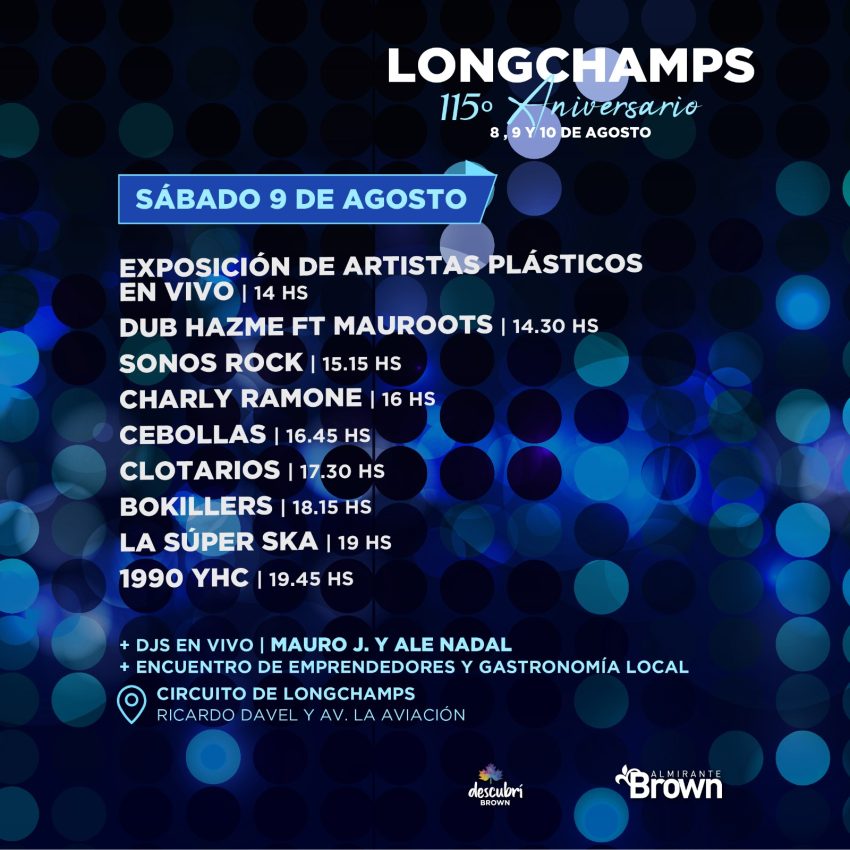 El Municipio de Almirante Brown informó la celebración del aniversario de Longchamps con numerosas actividades artísticas y recreativas, el encuentro de emprendedores locales y shows en vivo, además del tradicional acto oficial.