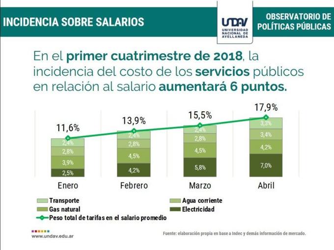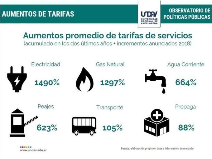 Por su parte, el Observatorio de Políticas Públicas de la Universidad marca que los aumentos promedio acumulados en los últimos dos años, dan un incremento del 1490% en la electricidad, 1297% en el gas natural, 664% en el agua corriente, 623% en los peajes y 105% en el transporte.