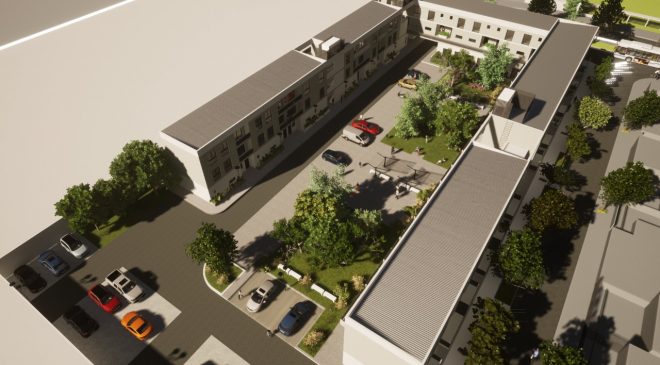 En el predio donde se trabaja, ubicado frente al Cementerio Jardín, antes había un terreno baldío. A través del programa «Casa Propia-Construir Futuro», comienza a desarrollarse este complejo residencial que, además de viviendas, genera trabajo.