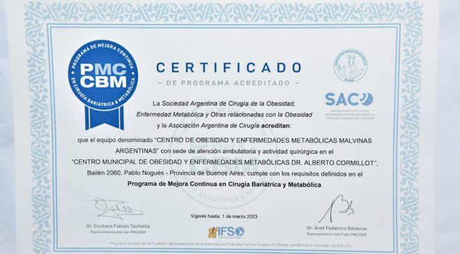 El «Centro de Obesidad Enfermedades Metabólicas Malvinas Argentinas» recibió un diploma de acreditación, otorgado por la Sociedad Argentina de Cirugía de la Obesidad (SACO) y la Federación Internacional de Cirugía de la Obesidad (IFSO), por cumplir los requisitos definidos en el Programa de Mejora Continua en Cirugía Bariátrica y Metabólica.