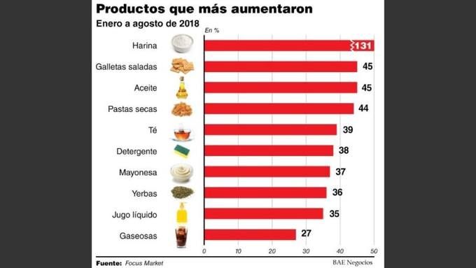 Sólo en el período que va desde enero a agosto de este año, la harina aumentó un 131%; galletas saladas y aceite, 45%; pastas secas, 44%; té, 39%; detergente, 38%; mayonesa, 37%; yerba mate, 36%; jugos líquidos, 35% y gaseosas, 27% en promedio