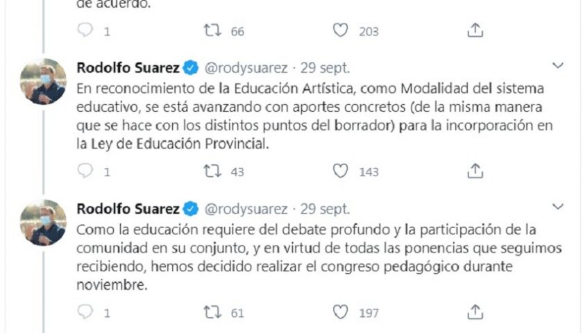 Al caso basta comprender por qué el propio mandatario mendocino recurre a responder los reclamos en modo de hilo y 140 caracteres, sin tomar en serio el planteo del sector educativo que reclama la apertura y participación de todos los actores sociales en lo que estiman pueda modificar estructuralmente a Mendoza.