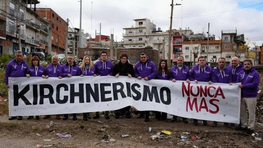 Con buzos violetas para hacer referencia al color que refiere a La Libertad Avanza, posaron con un cartel que hace referencia al informe de la Comisión Nacional sobre la Desaparición de Personas (CONADEP) que recabó y exhibió públicamente los crímenes de la última dictadura cívico-militar: “Kirchnerismo nunca más”.