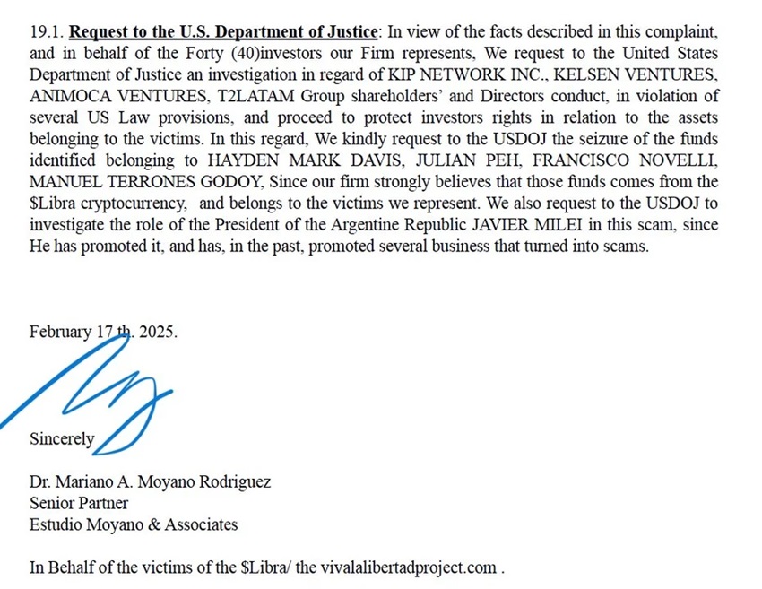 La acusación fue presentada por el estudio jurídico argentino Moyano & Asociados, que se especializa en casos de insolvencia internacional y fraudes financieros.
