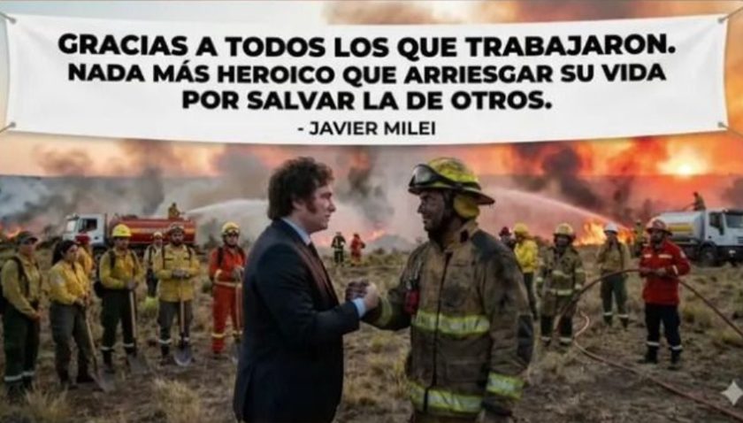 Siendo cabeza de una administración nacional que optó por recortar los fondos para el combate de los incendios forestales, el presidente Javier Milei les agradeció a los bomberos y brigadistas que combaten las llamas en la Patagonia a través de un escueto mensaje publicado en redes sociales. Como no viajó al lugar, el libertario decidió publicar una foto hecha con Inteligencia Artificial (IA).