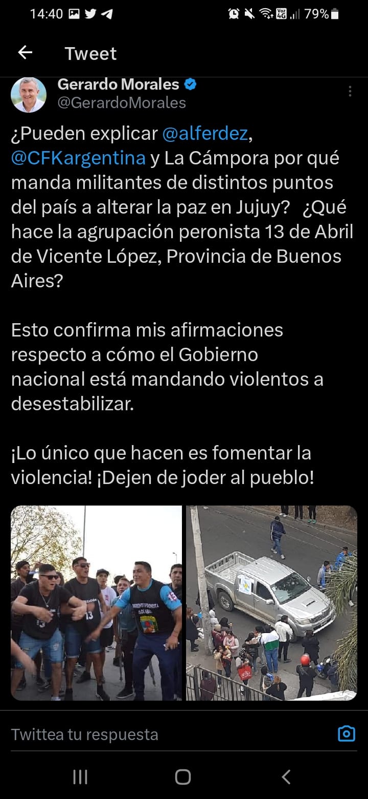 Con fotos falsas, el gobernador de Jujuy y precandidato a presidente, Gerardo Morales, responsabilizó al presidente Alberto Fernández y su vice Cristina Fernández de Kirchner por los incidentes generados a las puertas de la Legislatura de la provincia en el marco de las protestas contra la reforma de la Constitución provincial. Como la verdad comenzó a viralizarse, el mandatario debió borrar los mensajes.