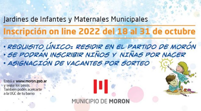 El Municipio de Morón dispuso un registro online para la asignación de vacantes para quienes quieran inscribir a niños y niñas del distrito en alguno de los 16 jardines municipales. La inscripción estará abierta entre el 18 y el 31 de octubre. Para presentar la solicitud, es necesario tener domicilio en Morón y completar el formulario con datos verdaderos. En el caso de personas gestantes que deseen solicitar una vacante para su futuro hijo o hija, será condición presentar el certificado con la fecha aproximada de parto.