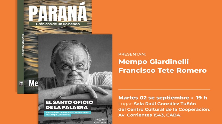 El martes 2 de septiembre, el escritor Mempo Giardinelli estará presente a las 19 horas en la Sala Raúl González Tuñón del prestigioso Centro Cultural de la Cooperación Floreal Gorini presentando sus dos últimos libros: “Paraná. Crónica de un río herido” y “El santo oficio de la palabra. Entrevistas de Francisco Tete Romero con Mempo Giardinelli”.