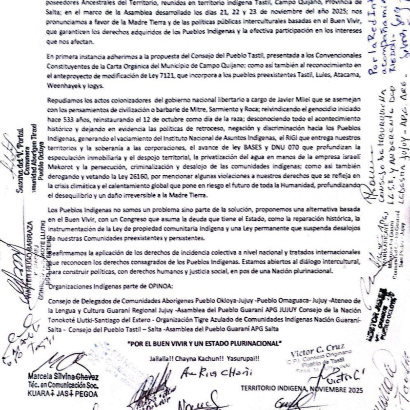 Las Organizaciones de Pueblos Indígenas del NOA – OPINOA – ejerciendo la Libre Determinación y como poseedores Ancestrales del Territorio, reunidos en territorio indígena Tastil, Campo Quijano, Provincia de Salta; en el marco de la Asamblea desarrollado los días 21, 22 y 23 de noviembre del año 2025; nos pronunciamos a favor de la Madre Tierra y de las políticas públicas interculturales basadas en el Buen Vivir, que garanticen los derechos adquiridos de los Pueblos Indígenas y la efectiva participación en los intereses que nos afectan.