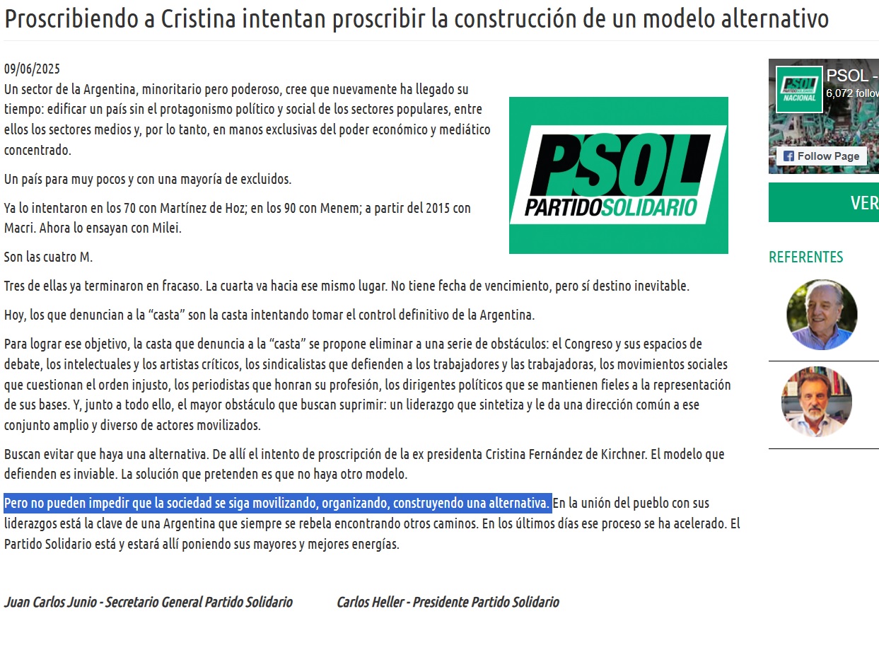 El Partido Solidario se pronunció en contra del posible fallo de la Corte Suprema contra la expresidenta Cristina Fernández de Kirchner, en el marco de la causa Vialidad.