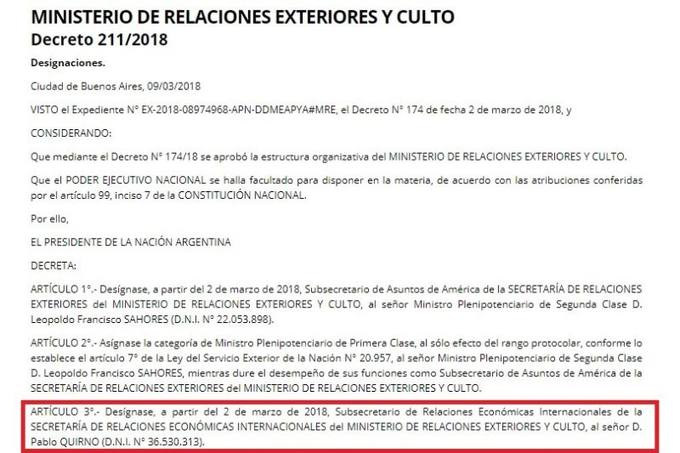 Se trata de Pablo Quirno, un joven de tan solo 26 años. Fue designado Subsecretario de Relaciones Económicas Internacionales de la Secretaría de Relaciones Económicas Internacionales del Ministerio de Relaciones Exteriores y Culto, un puesto de suma importancia dentro del Palacio San Martín.