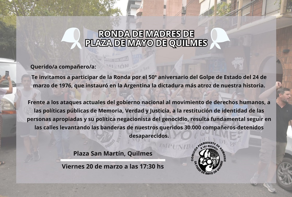 La Comisión de Homenaje a las Madres de Plaza de Mayo de Quilmes invita a participar de la ronda que se realizará este viernes 20 de marzo a las 17:30 hs en la Plaza San Martín de Quilmes, en el marco del 50º aniversario del Golpe de Estado del 24 de marzo de 1976, que instauró en la Argentina la dictadura más atroz de nuestra historia.