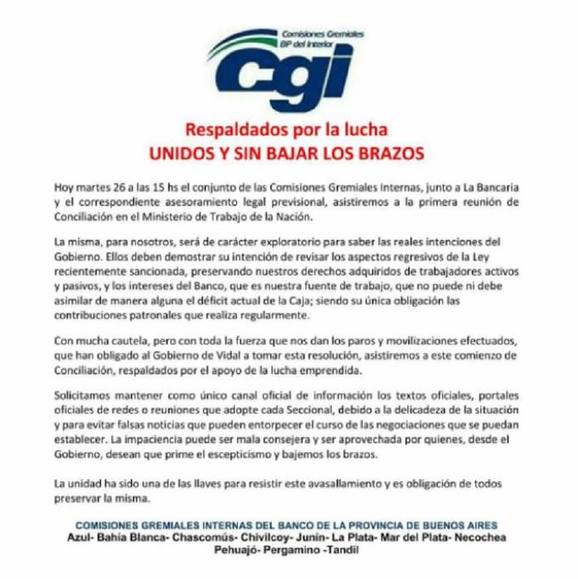Las Comisiones Gremiales Internas del Banco de la Provincia de Buenos Aires (CGI) asistirán, junto a La Bancaria, a la primera reunión de conciliación en el Ministerio de Trabajo, cartera conducida por Jorge Triaca.