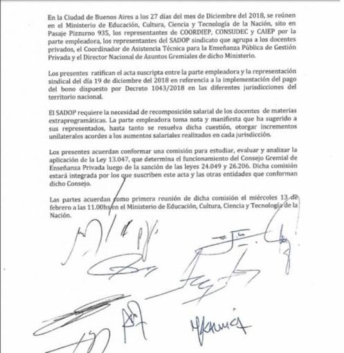 El Sindicato Argentino de Docentes Privados (SADOP) y las Cámaras representantes de las instituciones particulares ratificaron el acuerdo por el cual los empleadores se comprometen a pagar el bono de fin de año, otorgado por el Ejecutivo nacional, a través del Decreto 1043/2018.