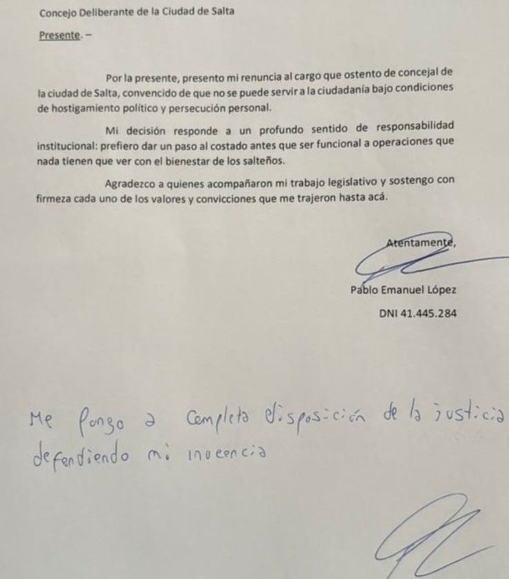 El concejal libertomacrista por la capital salteña, Pablo Emanuel López, presentó su renuncia luego que se hicieran virales los audios en donde el ex funcionario comete extorsión y acoso sexual a una compañera de su propio espacio partidario.