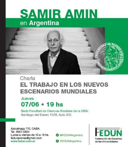 En su paso por la Argentina, el prestigioso economista egipcio, Samir Amin, brindará una serie de charlas organizadas por la Federación de Docentes de las Universidades (FEDUN), la Federación de Sindicatos de Docentes Universitarios de América del Sur (FESIDUAS), el Centro de Investigaciones en Política y Economía (CIEPE) y el Frente de Comunicación por la Expresión de los Pueblos.