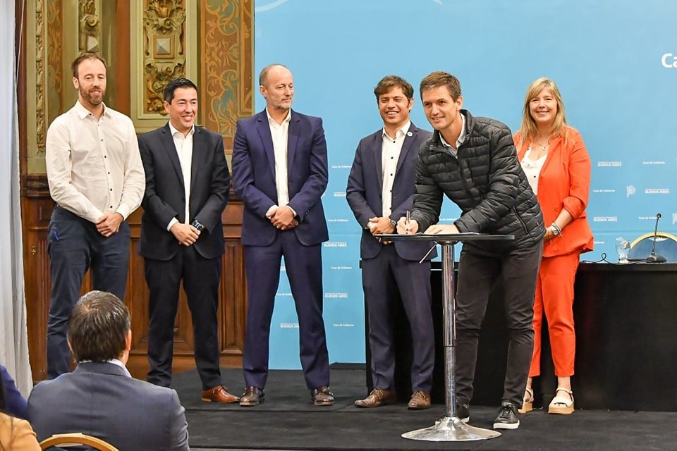 El acto fue en el Salón Dorado de la Casa de Gobierno, junto al jefe de Gabinete, Martín Insaurralde; los ministros de Infraestructura y Servicios Públicos, Leonardo Nardini; y de Hacienda y Finanzas, Pablo López; y la ministra de Gobierno, Cristina Álvarez Rodríguez.