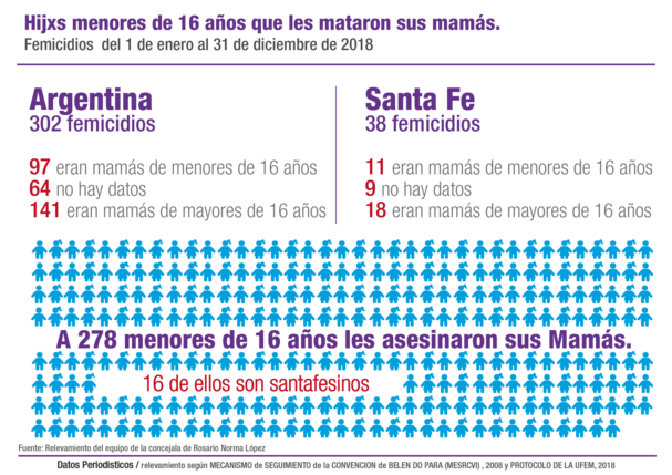 A nivel nacional, 97 mujeres muertas víctimas de femicidios eran madres de personas menores de 16 años; de 64 no hay datos y 141 tenían hijas e hijos mayores de 16 años. En la provincia, de las 38 mujeres, 11 eran mamás de menores de 16 años, de 9 no hay datos y 18 no eran madres. En total, son 278 menores de 16 años a quienes les mataron sus mamás, de los cuales 16 son de Santa Fe.