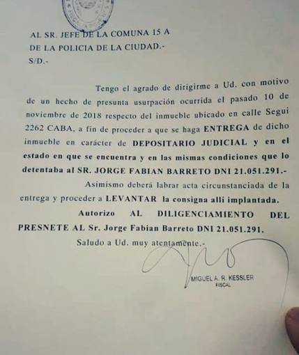 Fue la fiscalía penal contravencional y de faltas N°5, a cargo Dr. Kessler, que ordenó la restitución del inmueble y la designación como depositario judicial de la fábrica y sus bienes al Presidente de la cooperativa.