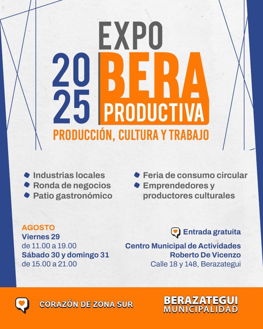 La Expo Bera Productiva 2025 se desarrollará a lo largo de tres jornadas, durante el 29, 30 y 31 de agosto, en el Centro Municipal de Actividades Roberto De Vicenzo y en el Complejo Cultural Municipal La Calle (148 y 18). Además de la 9na Ronda Multisectorial de Negocios -con más de 300 inscriptos-, incluye exhibiciones de industrias Pymes locales, la Feria Sabores Bonaerenses, emprendedores y productores culturales, charlas y artistas en vivo.
