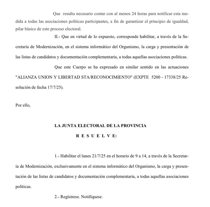 A las 3 de la madrugada del domingo, la Junta Electoral de la Provincia de Buenos Aires decidió prorrogar el plazo para la presentación de candidaturas y la entrega de información complementaria hasta el lunes 21 de julio a las 14 horas.