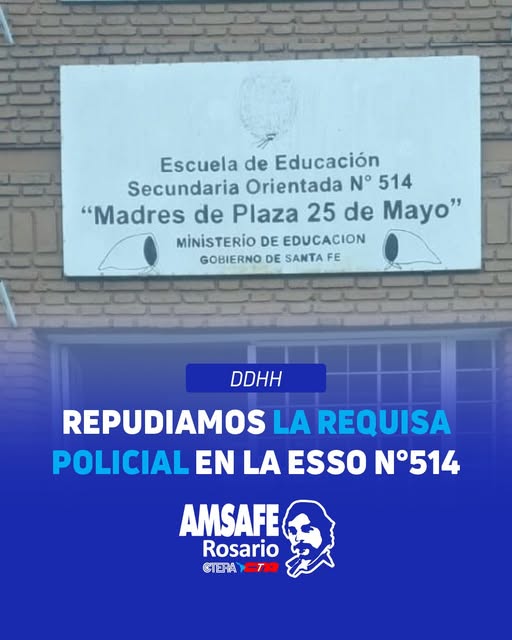 «Desde Amsafé Rosario expresamos nuestra profunda preocupación y repudiamos la intervención de las fuerzas policiales en la ESSO N°514 Madres de Plaza 25 de Mayo, el día viernes 29 de agosto a las 15:15hs, en la que se requisó a los alumnos. Esta acción generó un clima de miedo y ansiedad entre los estudiantes, personal docente y no docente y la comunidad educativa toda, este accionar vulneró el derecho a un entorno educativo seguro y protegido» rezaba el posteo. «Consideramos que la presencia policial en la escuela debiera ser evitada en pos de proteger el bienestar emocional de los alumnos. Exigimos que se investigue esta situación y se tomen medidas para evitar que se repitan incidentes similares en el futuro. Los estudiantes tienen derecho a un entorno educativo seguro. Las escuelas deben ser Territorios de Paz» menciona el posteo.”