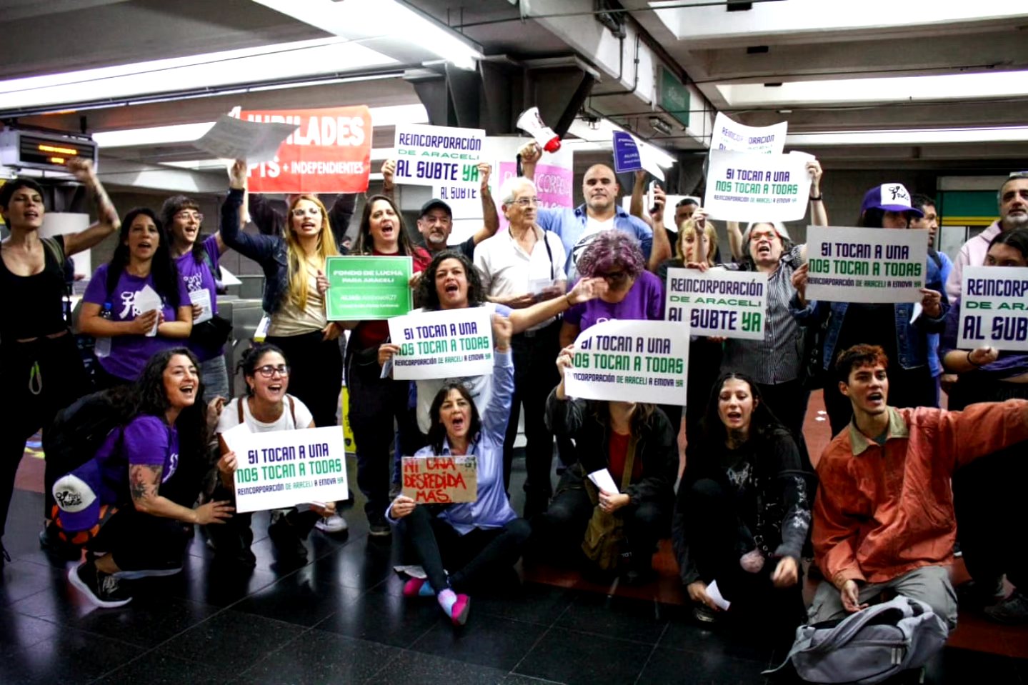 Claudio Dellecarbonara, Sec. Ejec. Asociación Gremial de Trabajadores del Subterráneo y Premetro AGTSyP, en expresiones públicas dijo: «Esta apertura que inaugura la jornada de lucha del 8M, insiste en el reclamo de la reincorporación a su puesto de trabajo en el subte de Araceli Pintos, despedida en forma persecutoria, ilegal y discriminatoria después que denunciara acoso sexual sufrido en su lugar y horario de trabajo de parte de un policía de la Ciudad.»