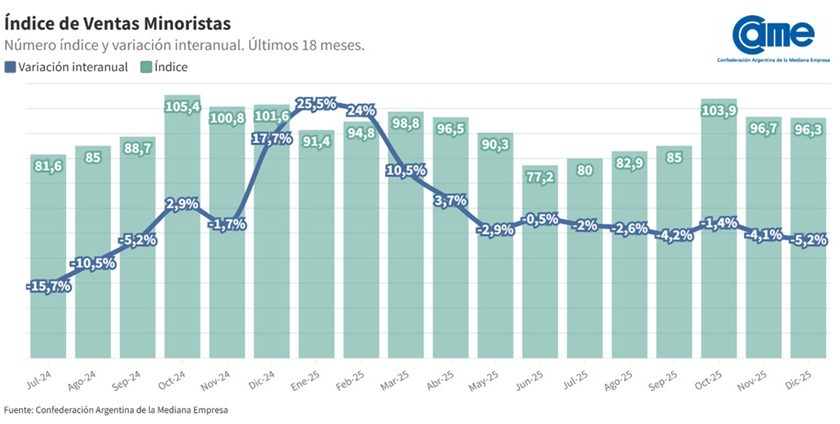 Diciembre cerró con un retroceso interanual del 5,2% a precios constantes en lo que respecta al comercio minorista pyme, con seis de los siete rubros relevados finalizando el 2025 con números rojos.