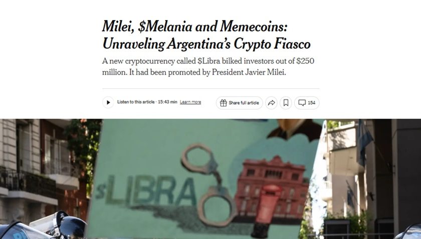 Además, la nota del New York Times menciona un audio de Hayden Davis, involucrado en el escándalo de $LIBRA, en el que presuntamente se jacta de su influencia sobre Milei y su entorno. “Todo, desde los tuits de Milei hasta básicamente todas las cosas que se presentan de frente, tengo control sobre muchas de esas palancas. Pero tiene un costo”, se escucha decir a Davis en un mensaje enviado a otro empresario.