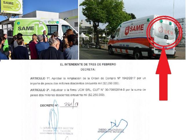 La empresa Unidad Coronaria Morón S.R.L. figura en el Decreto N° 261/18 de fecha 5 de abril del corriente, mediante el que se amplía una licitación “por contratación de ambulancias a la empresa UCM SRL, por $ 4.500.000”, añadiendo una orden de compra por $2.250.000. Según los trabajadores del SAME, la empresa ya no cuenta con la tecnología necesaria para ser catalogada “de alta complejidad”.