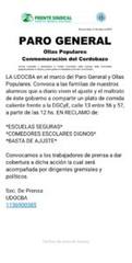 «La UDOCBA, en el marco del paro general y ollas populares, convoca a las familias de nuestros alumnos que a diario viven el ajuste y el maltrato de este gobierno a compartir un plato de comida caliente frente a la DGCyE, calle 13 entre 56 y 57, a partir de las 12», expresa un comunicado de la entidad sindical.