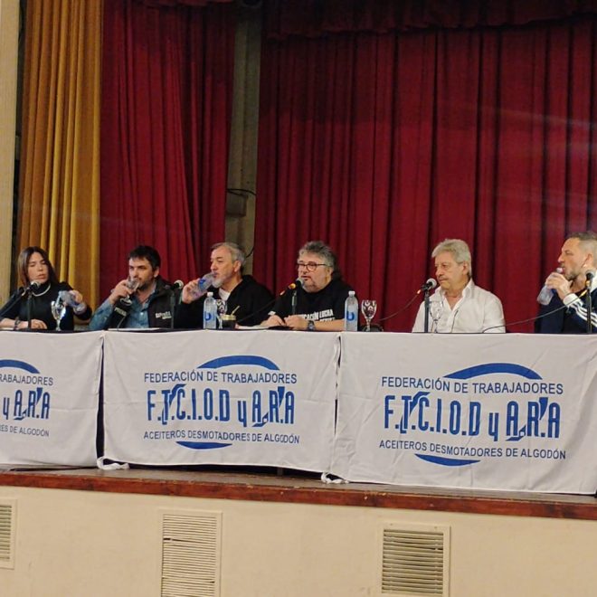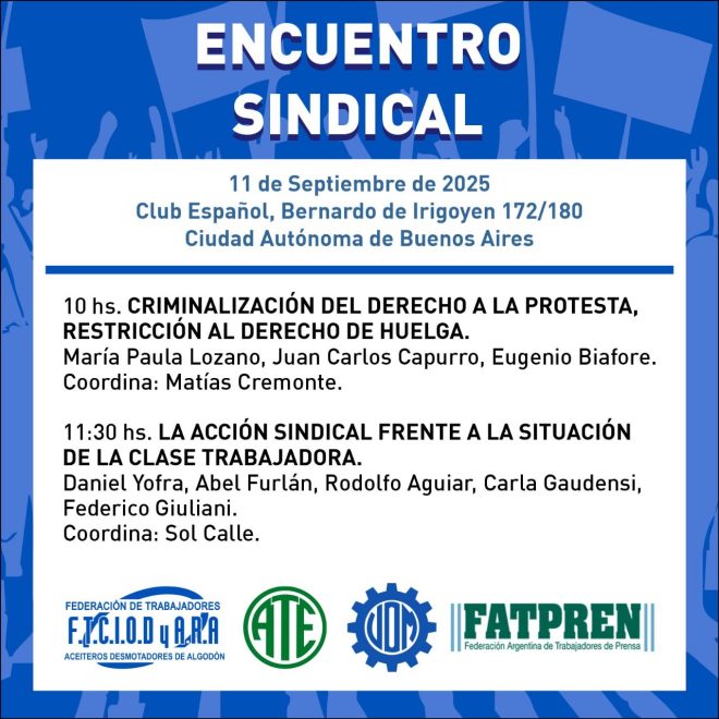 Este jueves se realizó un Encuentro Sindical que reunió a 280 delegados y delegadas de gremios del sector público y privado, con representación de la CGT, las dos CTA y sindicatos combativos de base. El encuentro contó con la participación de dirigentes como Daniel Yofra (Federación Aceitera y Desmotadora de Algodón), Abel Furlán (UOM), Rodolfo Aguiar (ATE) y Agustín Lecchi (SiPreBA).