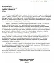 «En el día de hoy, la Dra. Cristina Fernández de Kirchner, fue invitada al programa «Morfi, todos a la mesa». Dados los comentarios públicos de algunos periodistas y funcionarios del gobierno, la comisión interna-Telefé del Sindicato Argentino de Televisión (SATSAID), desmiente categóricamente que las personas que se acercaron para saludar y dar su apoyo a la candidatura a senadora nacional por Unidad Ciudadana, no eran empleados de Telefé, y que «estaba todo armado», así comienza el comunicado de prensa publicado por SATSAID.