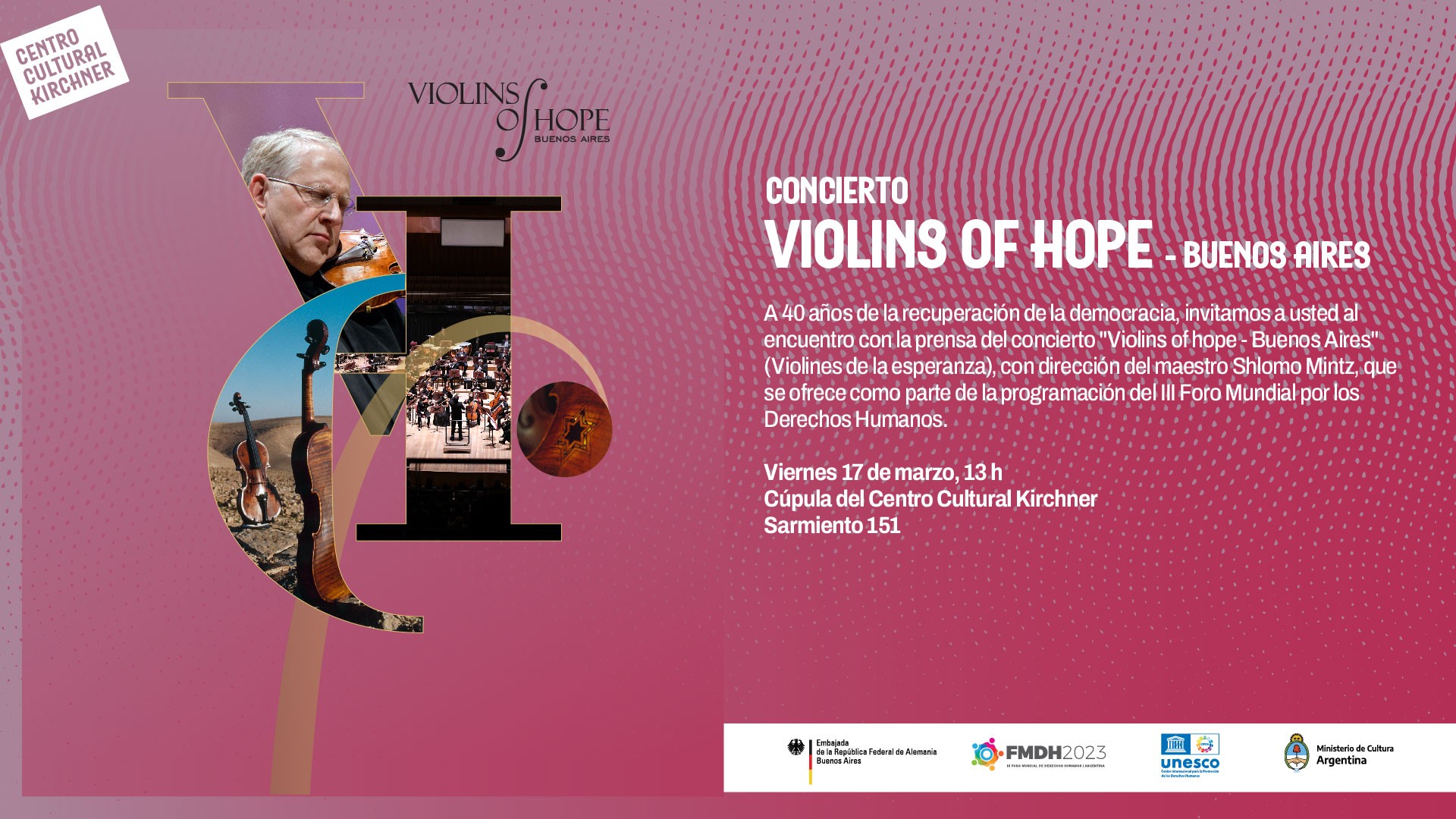 El Ministerio de Cultura, el Centro Cultural Kirchner y la Embajada de Alemania invitan a la conferencia de prensa de Violines de la Esperanza (Violins of Hope) que se realizará el próximo viernes 17 de marzo a las 13 en el Centro Cultural Kirchner con motivo del concierto que tendrá lugar en el Auditorio Nacional. Estarán presentes autoridades del Ministerio, de la Embajada, integrantes de los Violines de la Esperanza y de la Orquesta Sinfónica Nacional.