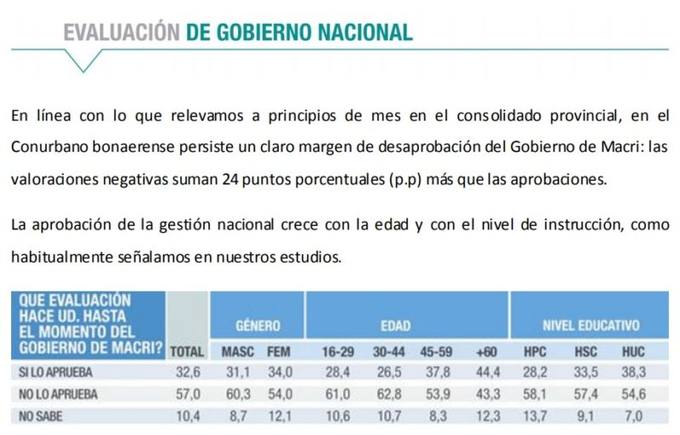 El sondeo de opinión sobre distintos temas de coyuntura en 28 partidos del Gran Buenos Aires, lanzó un claro margen de desaprobación del Gobierno del líder de Cambiemos: las valoraciones negativas suman 24 puntos porcentuales más que las aprobaciones (57% y 32,6% respectivamente).