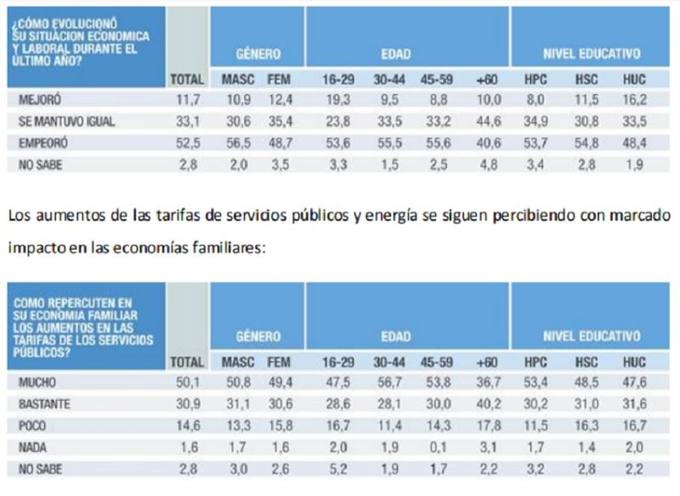 La misma línea siguió en la siguiente consulta acerca de la repercusión que tienen un sus familias los aumentos en las tarifas de los servicios públicos. Un 81% indicó que el incremento repercute “entre bastante y mucho”.